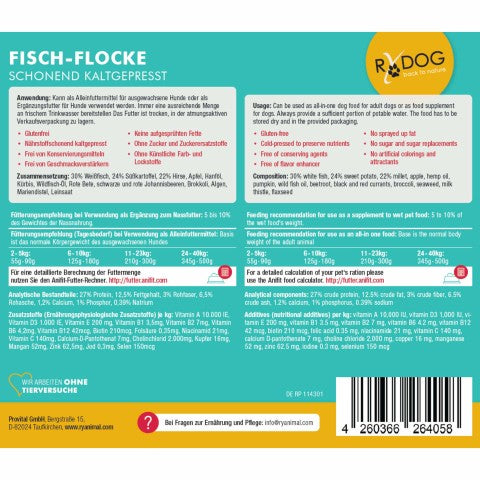 Die Herstellung der RyDog Fisch-Flocke erfolgt unter höchsten Qualitätsstandards direkt in Deutschland. Durch die heimische Produktion wird sichergestellt, dass nur erstklassige Rohstoffe verwendet werden, während gleichzeitig auf eine verantwortungsvolle und nachhaltige Verarbeitung geachtet wird.